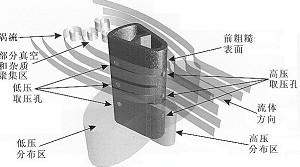 傳感器是由檢測桿、取壓口和導(dǎo)桿組成,它橫穿管道內(nèi)部與管軸垂直,在測桿的迎流面上設(shè)有多個(gè)測壓孔測量總壓平均值,在其背、側(cè)流面有測量靜壓測壓孔,分別由總壓導(dǎo)壓管和靜壓導(dǎo)壓管引出,根據(jù)總壓與靜壓的差壓值,計(jì)算流經(jīng)管道的流量。也可以用流量管壁靜壓代替?zhèn)鞲衅鞅沉髅娴撵o壓。